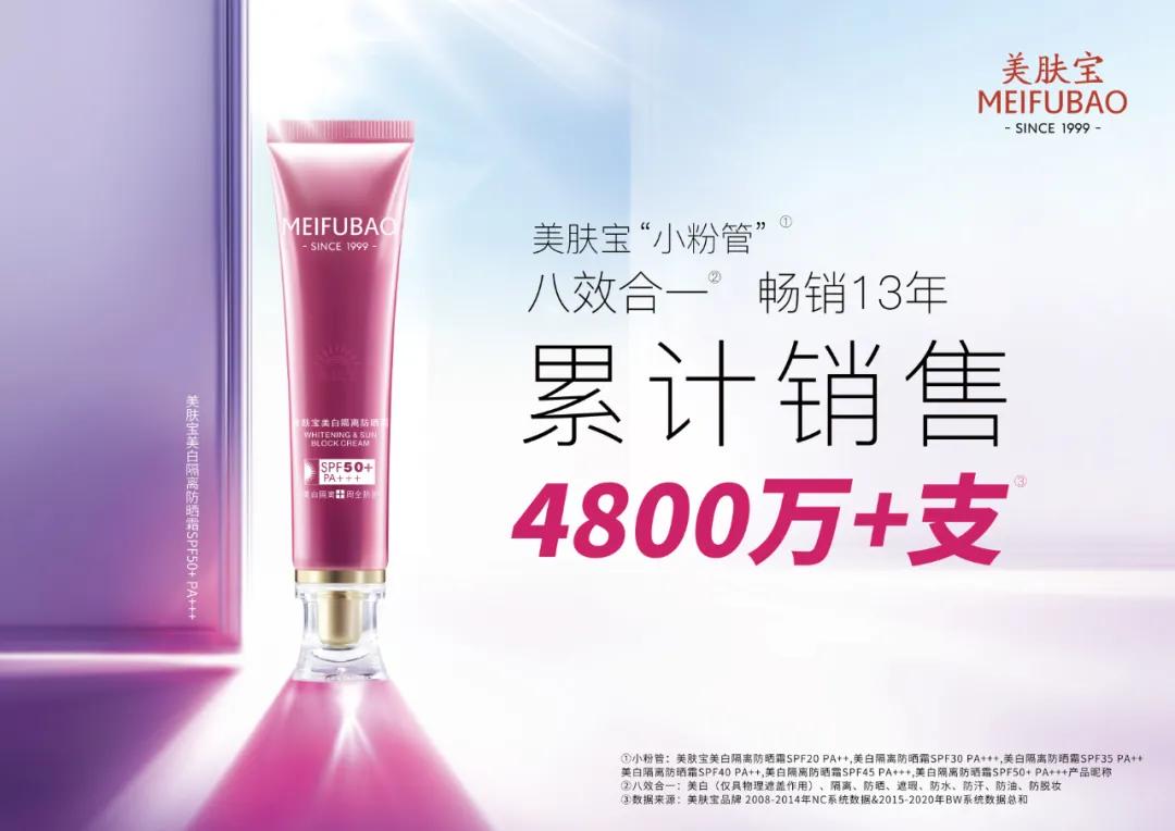 此外,為適應(yīng)市場需求,美膚寶集美白、隔離、防曬、修顏、遮瑕、防水、防汗、防脫妝八大功效合一的防曬產(chǎn)品小粉管,因其平價、全能的優(yōu)勢,在小紅書、抖音等平臺被廣泛“種草”,連續(xù)8年防曬品類top1,暢銷13年累計銷量4800萬支,成為現(xiàn)象級產(chǎn)品。