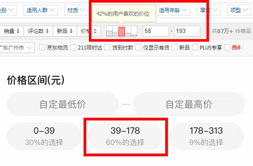 通過京東、淘寶上多人瀏覽的防曬衣價格區(qū)間,以及淘寶上銷量前幾名的防曬衣價格,可大致推斷出消費者認為合理的價格。/網(wǎng)頁截圖