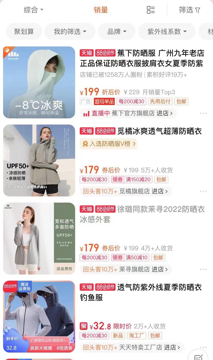 綜合京東、淘寶、小米有品等電商平臺顯示的用戶偏好情況,被瀏覽和收藏多的防曬衣價格區(qū)間為32—299元;高銷量的防曬衣,價格也基本集中在此區(qū)間內(nèi)。可大致推斷,防曬衣的正常市場單價不超300元。