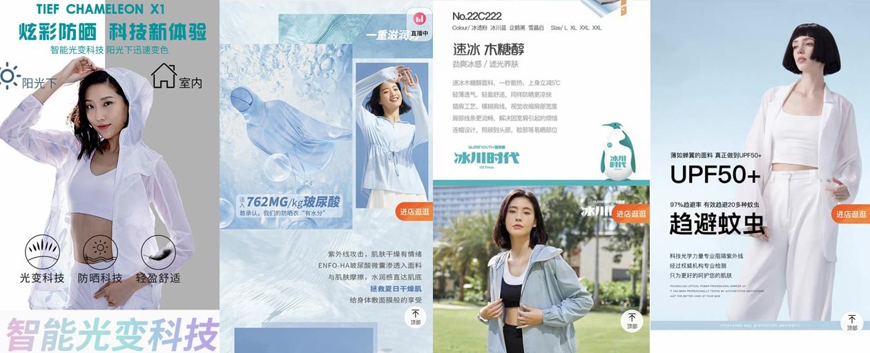 但防曬,恰恰是消費者購買防曬衣的原始目的。至于后面出現(xiàn)的“冰肌”“變色”“保濕”等需求,極大程度上,是品牌創(chuàng)造并強加消費者的。