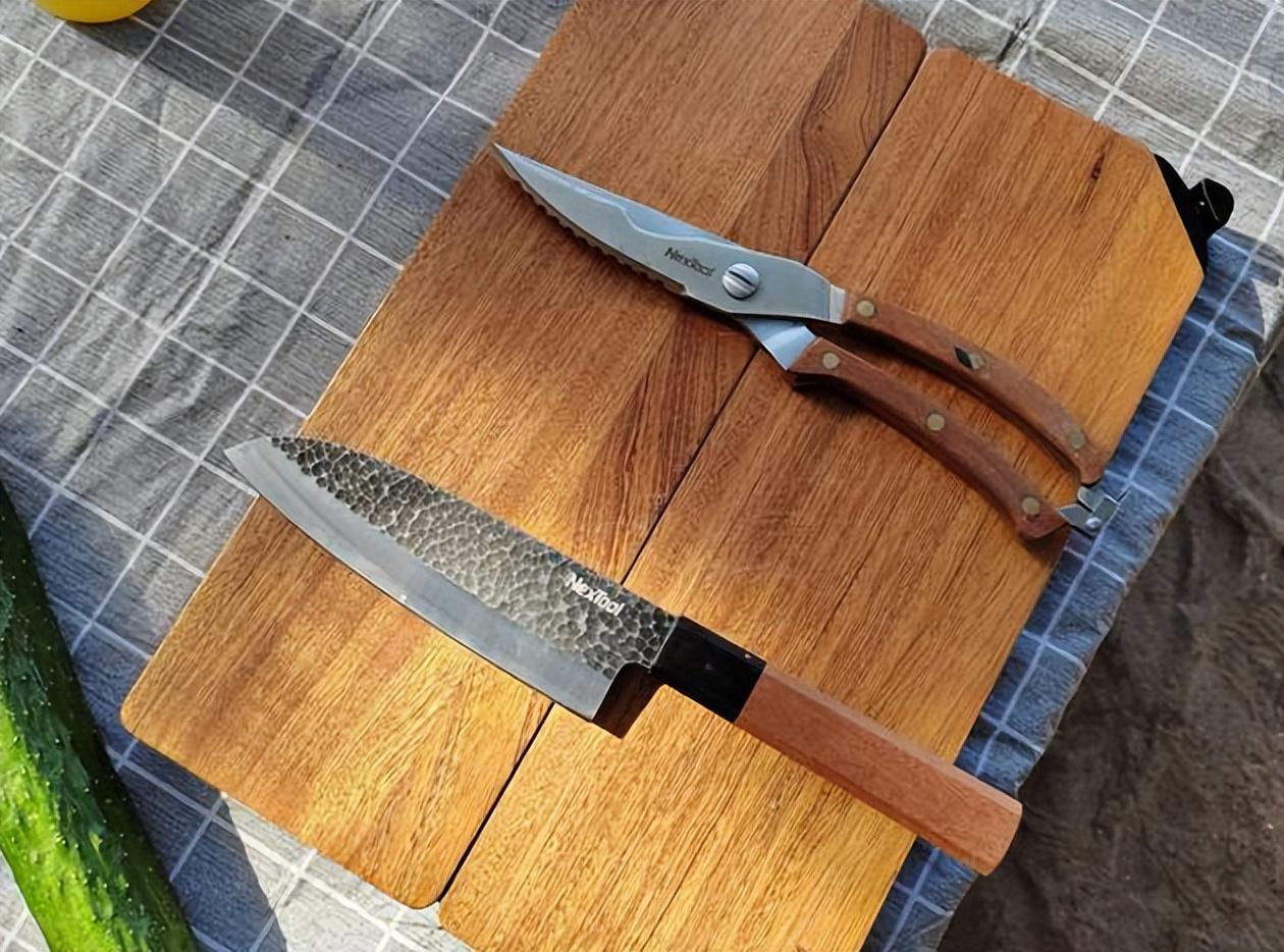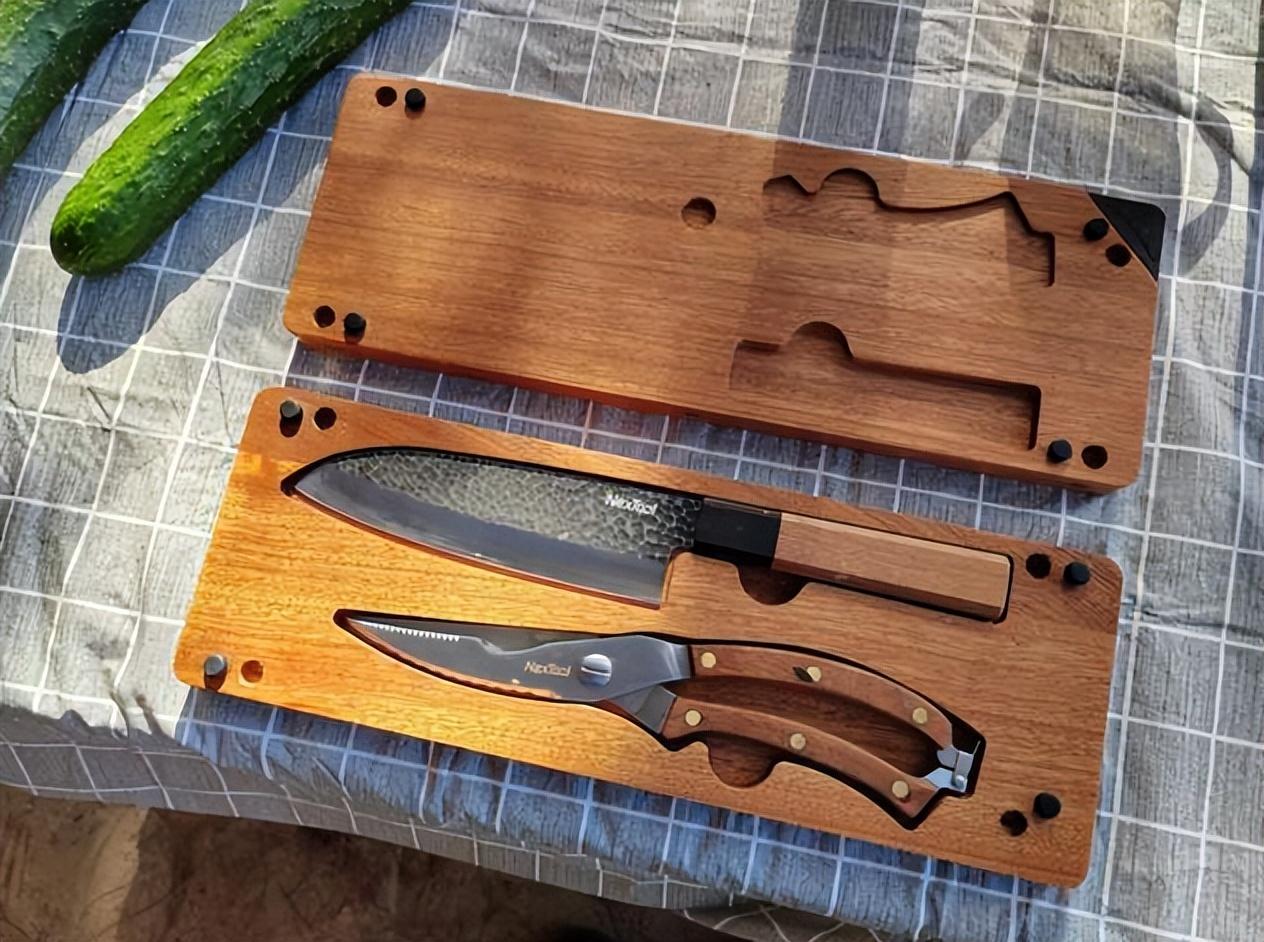 納拓營地料理師里面分別是一把三德刀造型的廚師刀以及一把多功能廚房剪,使用時可以滿足各種切、割、剪、鉸等等操作,無論是應(yīng)付各種蔬菜肉類,還是魚蝦水產(chǎn)品都完全沒有任何問題。