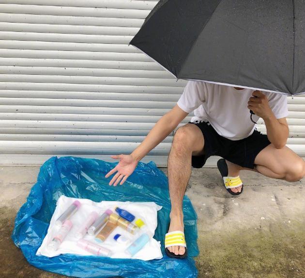 照片中,許魏洲身穿白T黑短褲配休閑拖鞋,他撐著一把遮陽傘并擋住臉部,蹲在攤位前給大家展示各式各樣的防曬霜,搞怪十足。這些防曬霜真的有可能是他自己的,網(wǎng)友調(diào)侃:“攤主露臉可能價格可以賣高一點!”