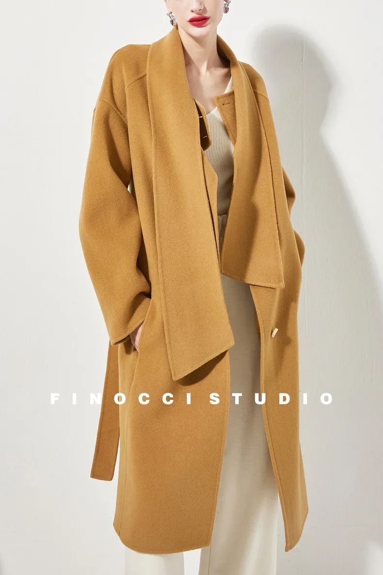 這件帶圍巾的兩件套大衣,面料是羊毛羊絨,很保暖。
