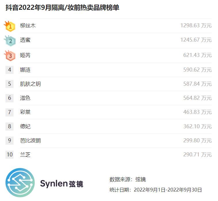 根據(jù)電商數(shù)據(jù)搜索工具——“弦鏡”數(shù)據(jù)顯示,抖音平臺2022年9月隔離/妝前熱賣品牌榜單,第一名柳絲木,銷售額為1298.63萬元。第二名透蜜,銷售額為1245.67萬元。第三名姬芮,銷售額為621.43萬元。從第四名到第十名分別為娜漣、肌膚之鑰、滋色、彩棠、德妃、芭比波朗、蘭芝。