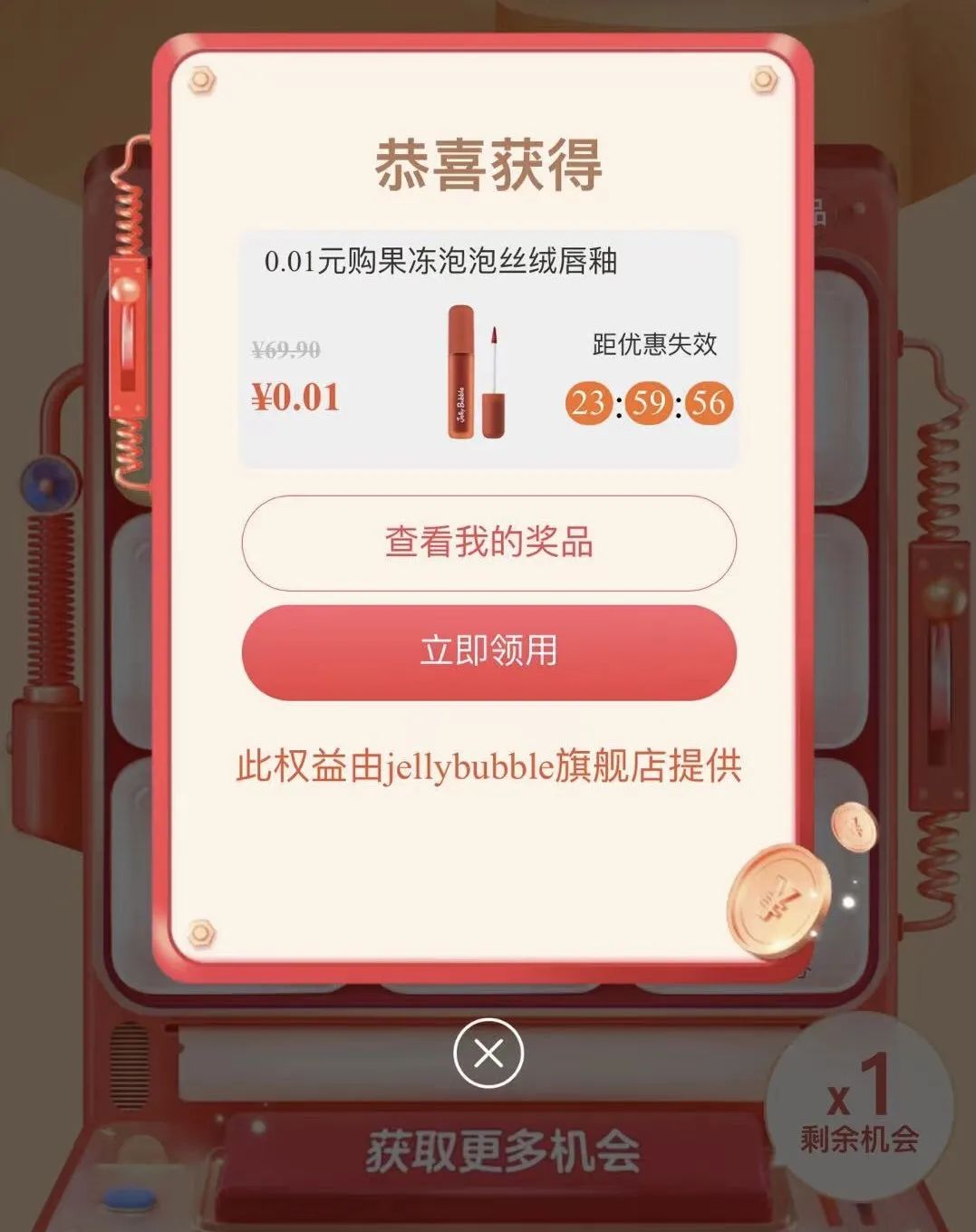 淘寶搜“全民尋寶有驚喜”,有機(jī)會(huì)抽到1分錢的唇釉、碗、濕巾、薯?xiàng)l什么的,都去試試,中獎(jiǎng)率還挺高的,抽到其他的就忽略吧