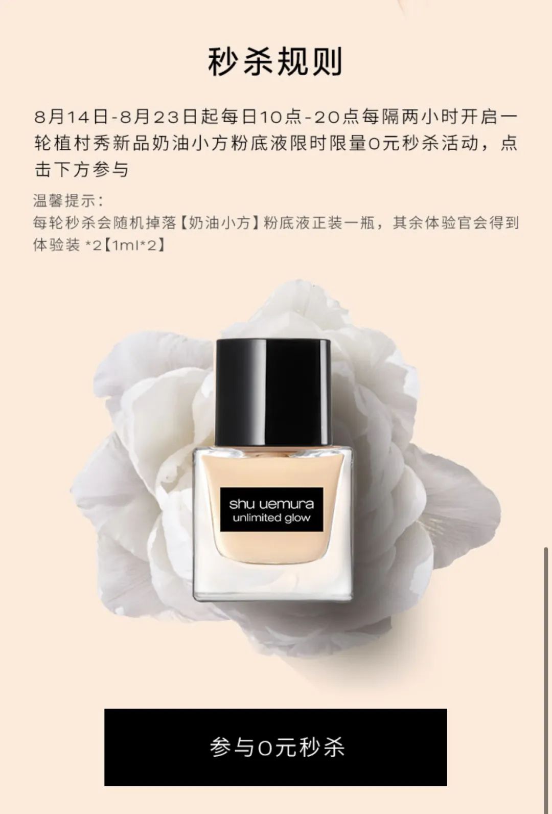 8月18日-8月23日每日10點(diǎn)/12點(diǎn)/14點(diǎn)/16點(diǎn)/18點(diǎn)/20點(diǎn),整點(diǎn)植村秀粉底液,包郵,先到先得
