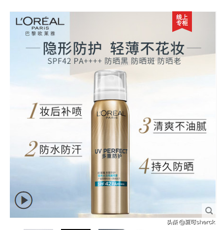 在化妝補防曬回復(fù)中我說了下,可以考慮化完妝用定妝防曬噴霧,這個產(chǎn)品我當(dāng)時看到了好像是哪個外國小眾的,現(xiàn)在沒找到了。這里說下吧。一般防曬噴霧因為上面說的溶劑,多半還是比較容易導(dǎo)致你花妝的,同時防曬劑也是油啊。但是一些防曬噴霧有特別設(shè)計,還有成膜系統(tǒng),可能對妝的影響很小了,比如圖片中那個歐萊雅噴霧,反正他是那么說妝后可用的,大家可以試試,但不了。