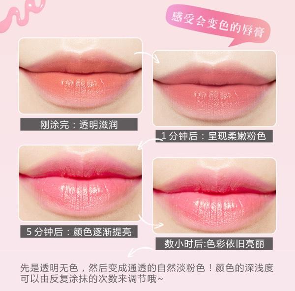 涂完之后,一開始唇部的顏色是透明的。但是一分鐘之后,唇部就會(huì)開始變色,變成淡淡的粉色,之后會(huì)根據(jù)你唇部的溫度和PH值做出顏色改變,呈現(xiàn)出只屬于你的唇色。