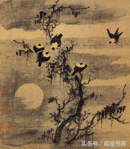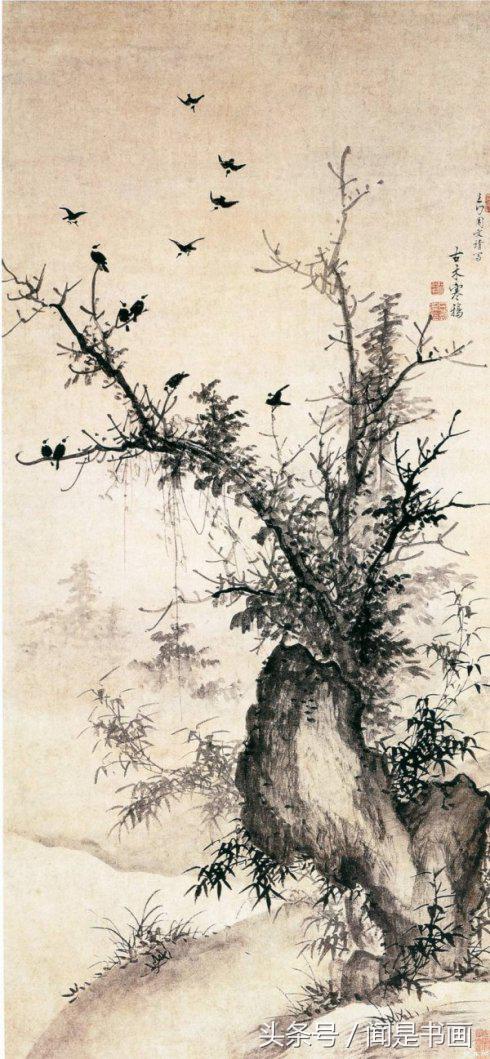 宋僧法常將佛情禪意也帶入自己的花鳥之作中,如其所作《枯樹八哥圖》,也是孤鳥寒枝以立的典型面貌。明呂紀(jì)也善寫寒禽,如其所作《雪景翎毛圖》、《雪岸雙鴻圖》,畫的均是寒天雪地中,寒禽縮頸而立,冷然欲逼人。而八大山人的禽鳥畫更生動地表現(xiàn)這孤寒境界,如作于其晚年的《浴禽圖》,筆法枯健,畫枯石當(dāng)立,石根處有一斜枝橫上,盤虬而上,枯枝上立一鳥展翅,自剔其羽,獨立寒天,而從容自度。尤其是那一只典型的“白眼”,更顯出冷眼看世界、孤迥立天地的精神。