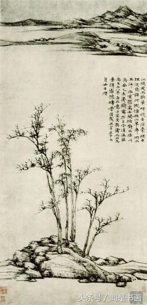 今從其流傳畫跡來看,中年時所作之《漁莊秋霽圖》,其后之《江岸望山圖》、《溪山圖》、《虞山林壑圖》、《紫芝山房圖》,以及晚年之《幽澗寒松圖》,均是如此。如《幽澗寒松圖》,是作者晚年得意之筆,畫面正中干筆勾出三四株蕭疏之樹,當(dāng)風(fēng)而立,木葉幾脫盡,旁側(cè)只是一灣瘦水,背面乃淡淡山影,極蒼古老辣。整個畫面所要突出的就是幾株枯樹,境界蒼涼凄清,沉著痛快,正具一種孤寒的韻味。