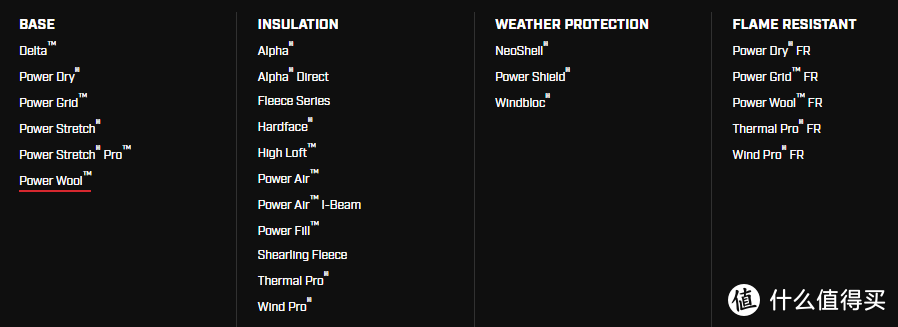 為了滿足不同使用場景的功能需求,POLARTEC按照穿搭層數(shù)可以分為BASE、INSULATION、WEATHER PROTECTION、FLAME RESISTANT四種主要類型,而在各型號下面,又有數(shù)十種子類型,可謂是品種豐富、一應(yīng)俱全。