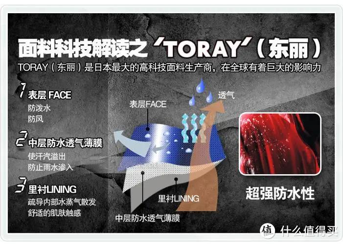 Dermizax面料采用3層貼合技術(shù),其中外層主要負(fù)責(zé)防潑水和防風(fēng)、中間層進(jìn)一步防止水分滲入,并實現(xiàn)汗汽溢出、內(nèi)層則是疏導(dǎo)水蒸氣散發(fā),其出色的面料特性,能實現(xiàn)20,000mm的暴雨級防水指數(shù)和20,000g/m2/24h的透氣指數(shù)。