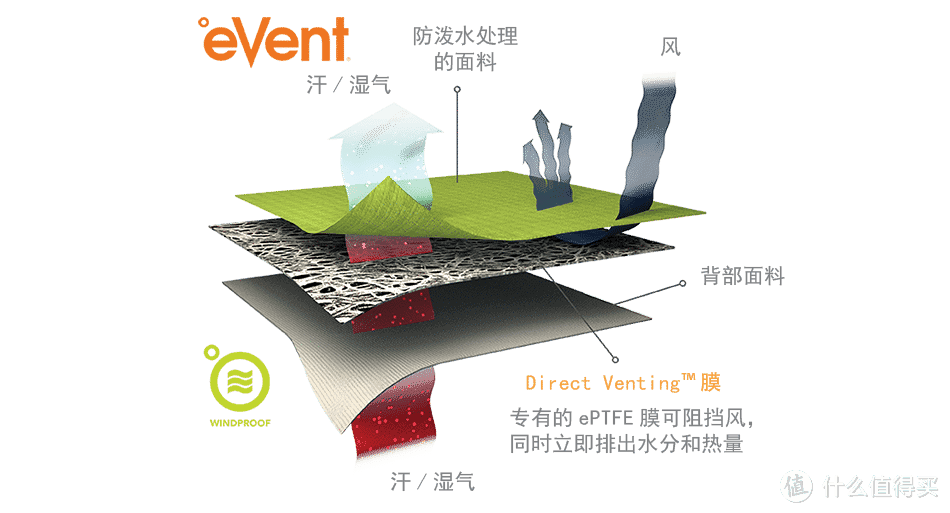 在防水面料市場占有率方面,eVent一度僅次于GORE·TEX。與后者原理相似的,同樣采用薄膜材質(zhì),通過高性能ePTFE表膜上數(shù)以萬計的微孔提供出色的防水性和透氣性。雖說在耐磨性方面不如GORE·TEX,但eVent勝在透氣性,相關(guān)測試數(shù)據(jù)表明,GORE·TEX面料透氣性能為每天每平方米1500~4000g,成績會根據(jù)環(huán)境濕度改變而發(fā)生變化,就是我在前文提到的,當(dāng)外界濕度較大時,GORE·TEX的透氣性就會變得比較差。而同樣條件下,eVent的透氣性始終能保持在5300g。
