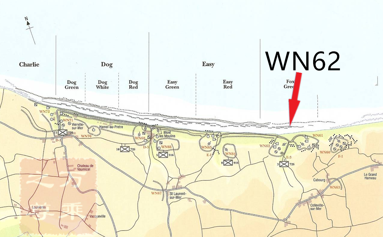 約翰·斯伯丁少尉率領的E連的一個排在WN62的西部登陸,在德軍的防御工事之間發(fā)現(xiàn)了一個缺口,并在7點30分左右爬過懸崖。兩個據(jù)點之間的壕溝布滿了地雷,兩架機槍在野戰(zhàn)壕溝中守衛(wèi),這條壕溝被命名為WN62a,就在今天的美國公墓所在地附近。斯伯丁的排擊潰了兩個機槍穴,繼續(xù)前進,隨著美軍步兵繞過據(jù)點,WN62附近的戰(zhàn)斗強度有所減弱。德軍陣地的彈藥開始耗盡,下午三點左右,在指揮地堡中幸存的少數(shù)部隊撤回到科勒維爾后,WN62據(jù)點基本被放棄。諾曼底登陸日WN62附近的戰(zhàn)斗清楚地說明了一個適度設防的陣地能多么有效地抵御步兵的攻擊。