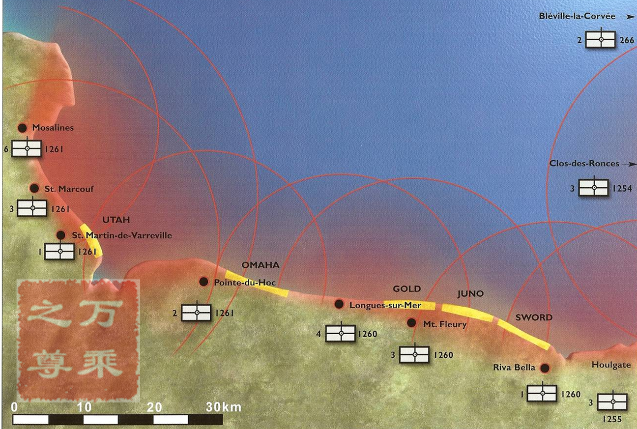 戰(zhàn)前的攻擊諾曼底登陸日的幾周前,盟軍開始對整個法國海岸發(fā)動空襲。由于擔心德國人會泄露進攻的確切位置,盟軍對諾曼底登陸日海灘的攻擊強度是有限的。沿海的大型炮臺和主要雷達站被挑出來特別加以注意。第一個被重擊的是圣馬爾庫夫的海軍炮隊,接著是在德克斯維爾、摩薩里納斯、加特維爾、佩爾內(nèi)勒和圣馬丁-德-瓦雷維爾的炮隊。雖然大多數(shù)混凝土工事保持完整,1944年5月,德國空軍在杜夫爾斯的大型雷達基地全部雷達被摧毀。盡管盟軍知道諾曼底海岸上每一個德軍主要防御工事的位置,但他們并不知道所有情況下的實際功能和武器裝備。特別是對沿海炮兵的類型和效力有幾個誤解,沒有充分認識到這些炮隊對登陸部隊的威脅。在諾曼底登陸日的早些時候,沿海的主要炮臺遭到了另一輪轟炸。在圣馬爾庫夫/克里斯貝克的康丁半島,豐特內(nèi)和圣馬丁-德-瓦雷維爾的3個在午夜左右被擊中,還有7架英國皇家空軍轟炸機在珀爾涅勒、梅西、角杜伊特、長芒、弗勒里山、烏斯特雷漢姆和霍勒蓋特等地投下了約5000噸的炸彈,這些空襲的價值有限。其中只有50枚落在炮臺內(nèi),只有一枚真正擊中了炮臺,沒有使其失效,