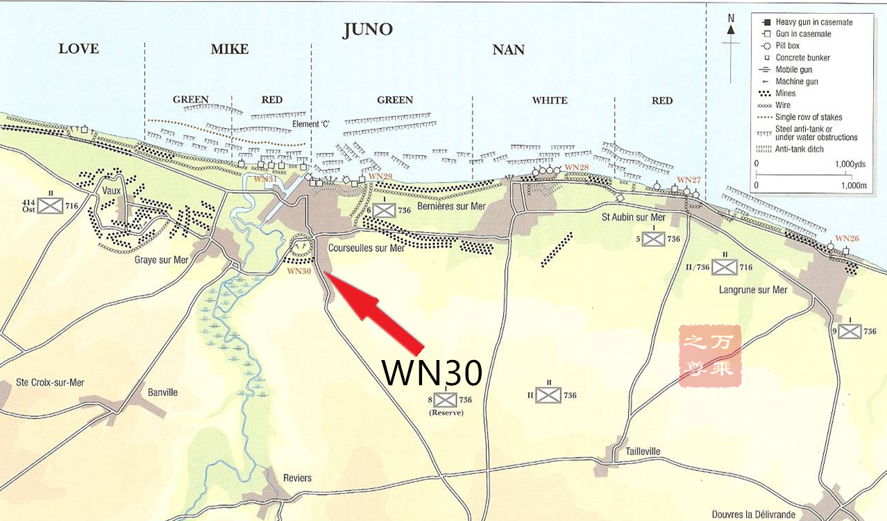 朱諾海灘的初步轟炸并沒有像預期的那樣有效,只有14%的預定目標失去了作用。然而朱諾海灘西側的掩體被海軍炮火摧毀,加拿大步兵第三師第7旅登陸時沒有受到攻擊,盡管如此,德國人的火力很猛,在一支五艘登陸艇的艦隊中,有四艘被迫擊炮、障礙物和障礙物上的地雷擊沉或嚴重損壞。WN30山上。一場激烈的逐家逐戶的戰(zhàn)斗持續(xù)了整個上午,后在中午時分包圍并占領了WN30。在朱諾海灘的東側,加拿大旅在來自WN27據(jù)點的火力下登陸在濱海小鎮(zhèn)圣奧賓。這個區(qū)域的海堤很高,有時超過3.6米。村子里有效的防御措施是在海堤的非標準掩體中安裝一門50毫米大炮,幾輛坦克在上岸后迅速地被接連擊倒,這個掩體持續(xù)戰(zhàn)斗了3個多小時,直到大約1115小時左右被來自陸地一側的步兵攻擊。48名英國突擊隊員在朗格魯恩附近的WN26前面上岸,上岸大約在9時左右進行,當時許多海上障礙物部分或完全淹沒在水下,對登陸艇造成了大面積破壞。