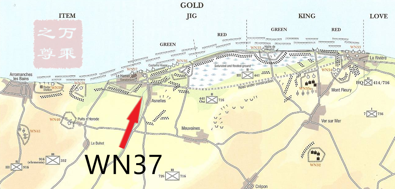 英國第50師進攻的黃金海灘有大量的據(jù)點。在黃金海灘的所有防御工事中,海灘西端WN37是麻煩的,地堡裝備有一戰(zhàn)時期的75毫米野戰(zhàn)炮。盟軍曾預料到這個據(jù)點會帶來麻煩,除了海軍轟炸之外,在登陸前不久,12架臺風戰(zhàn)斗轟炸機襲擊了這個據(jù)點,但沒有太大效果。當坦克和步兵上岸時,75毫米炮和一門50毫米炮對他們進行轟擊。75毫米炮至少擊毀兩輛坦克,還擊毀了一艘登陸艇的船頭,困住了里面的坦克。WN39位于西面2.5公里處的一座小山上,可以俯瞰黃金海灘。這個據(jù)點包括兩門75mm FK38野戰(zhàn)炮,其中一門對在金灘的英軍發(fā)射了124發(fā)炮彈。德國人對黃金海灘中心的防御不是那么強大,軍隊成功地克服了初的防御并向內(nèi)陸挺進,繞過了棘手的據(jù)點。黃金海灘東側的情況在某種程度上與西側相似,因為在WN33上有一門88毫米的Pak 43/41火炮,當英軍坦克到達海灘時,很快就遭到了攻擊。一輛謝爾曼連發(fā)坦克近距離接近掩體,對準槍眼進行了一次的射擊??偟膩碚f,由于海軍的初步有效轟炸,沿著黃金海灘的大量炮兵被證明比預期的危險要小得多。
