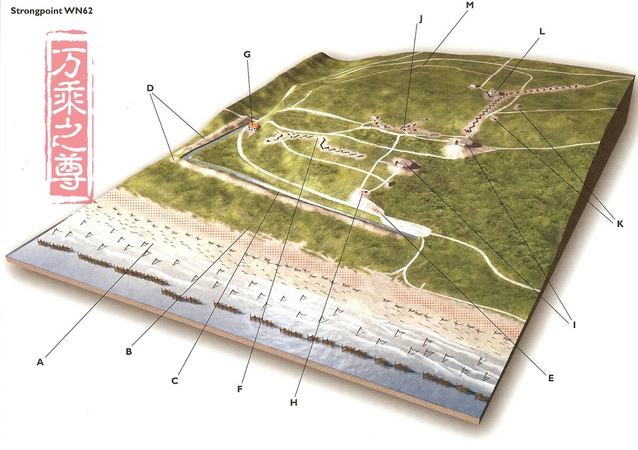 奧馬哈海灘是一個勝負難料的登陸點。戰(zhàn)斗持續(xù)了18個小時,進入海灘的溝渠都用碉堡加強防御,而出入口被反坦克墻、海堤、反坦克壕溝和其他障礙物封鎖,使坦克難以通過。由于云層遮擋,美國空軍轟炸機在數(shù)英里外未擊中目標,使下面的掩體毫發(fā)無損。雖然在登陸前曾有過一次海軍轟炸,但由于登陸時間取決于潮汐而奧馬哈登陸是早登陸的,轟炸持續(xù)的時間比其他海灘要短。進一步削弱攻擊,從WN59到WN64的這段海灘防御工事由第716步兵師第726擲彈團第3連和第352步兵師的一些援軍組成,由陸軍中尉指揮。愛德蒙胃痛。WN62位于E-3海灘西角。在黎明的海軍轟炸并沒有殺死31名在據(jù)點的士兵,6點30分左右,一隊M4坦克上岸,為奧馬哈海灘東側的第六步兵團提供了的坦克支援。坦克是對付眾多碉堡的少數(shù)手段之一。當來自第16步兵團登陸艇接近時,他們遭到了WN62幾挺機槍、兩門76毫米野戰(zhàn)炮、三門50毫米迫擊炮和一門50毫米炮的攻擊。槍、迫擊炮、大炮摧毀了第一波突擊部隊。