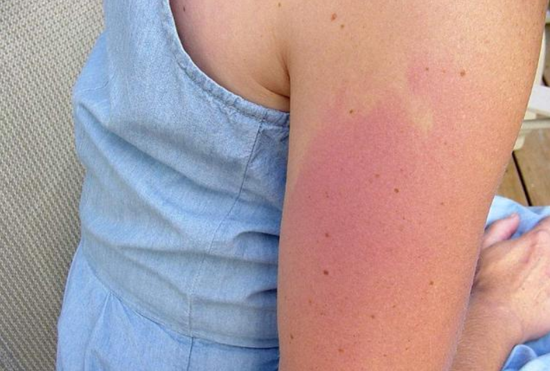 下圖是一位女性皮膚被紫外線曬傷后的圖片,通紅疼痛,甚至有點(diǎn)腫脹