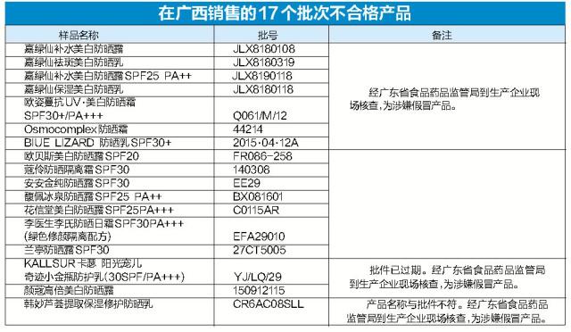 在廣西抽檢到的17批次不合格產品中,標稱為“嘉綠仙補水美白防曬露”、“嘉綠仙祛斑美白防曬乳”等4批次產品,分別在南寧市佳吉生物科技有限公司和南寧葛玄堂商貿有限公司銷售,未檢出批件和標簽中標示的防曬劑,經食品藥品監(jiān)管部門核查,為涉嫌假冒產品。
