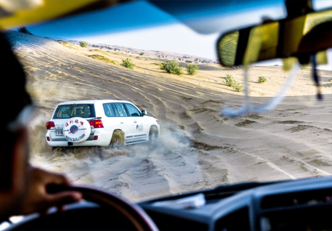 到達終點后,可以騎駱駝,或駕駛四驅(qū)車摩托,自己駕駛沖沙(后座可以坐人),結(jié)束后就在沙漠看舞蹈表演,自助烤肉。