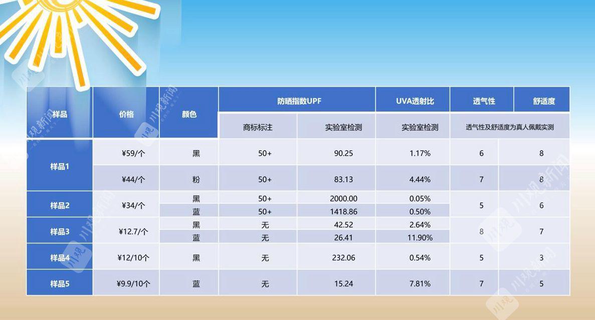 本次檢測(cè)樣品中,除了無(wú)明確標(biāo)注防曬指數(shù)的樣品3藍(lán)色口罩和普通醫(yī)用外科藍(lán)色口罩達(dá)不到推薦標(biāo)準(zhǔn)外,其他樣品均達(dá)到該要求。
