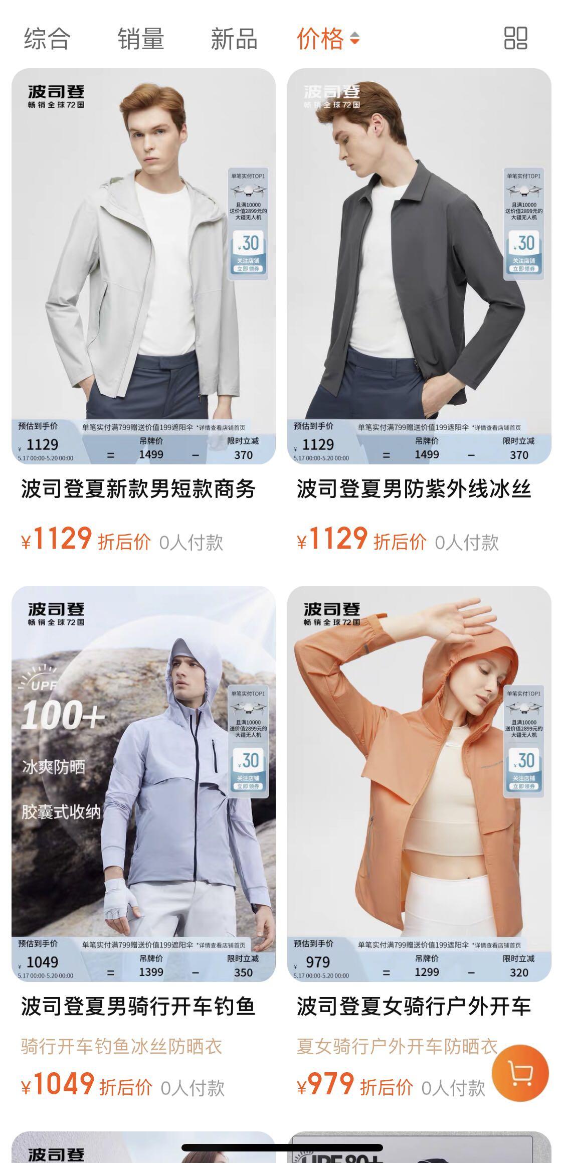 此外,防曬衣是該旗艦店的主推品類。波司登從長(zhǎng)度、面料科技、UPF值等維度推出了二十多款防曬衣,價(jià)格從200多元到1000元不等。而優(yōu)衣庫(kù)、蕉內(nèi)、Ubras的防曬衣基本在200元左右。