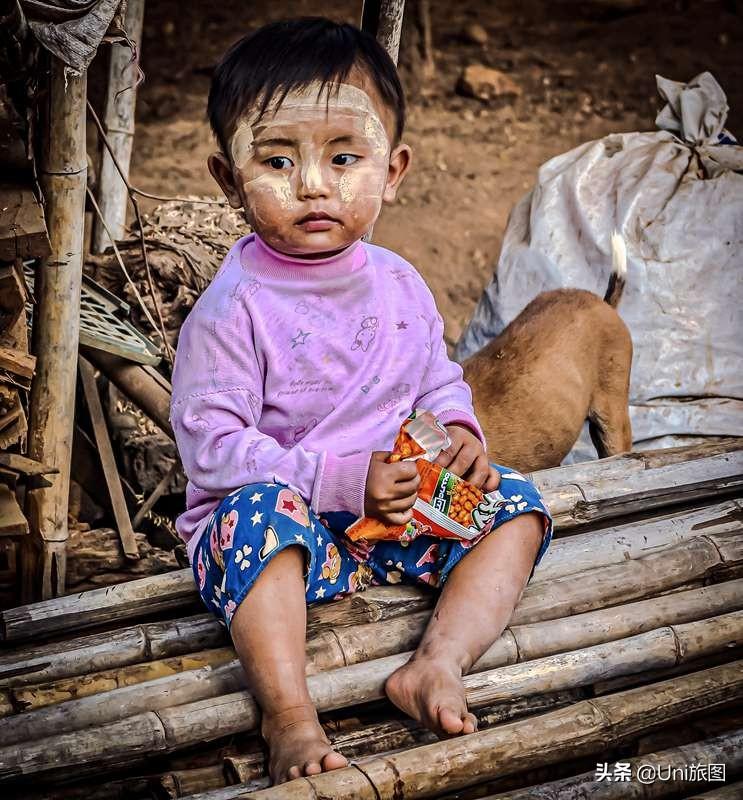 緬甸小孩,臉上涂著沿襲兩千多年的土制防曬霜“特納卡”。溪邊/攝