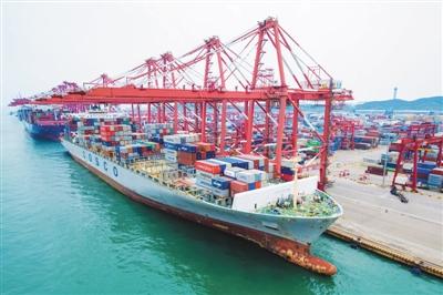 7月9日,山東青島港外貿(mào)集裝箱碼頭,貨輪在裝卸集裝箱。 俞方平攝(人民圖片)