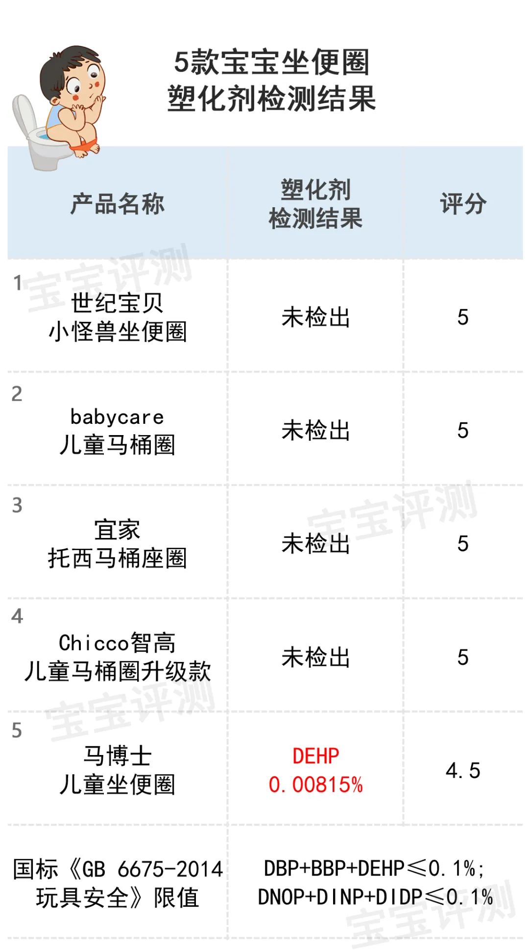 5款寶寶坐便圈的塑化劑檢測結果如下: