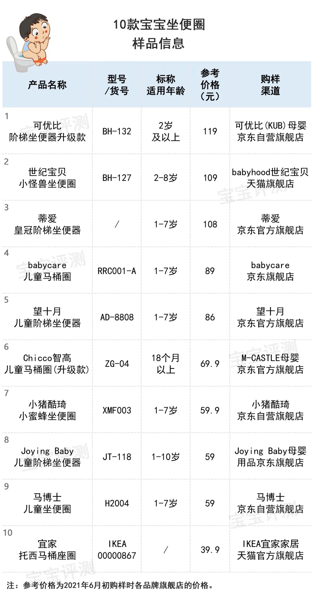 10款寶寶坐便圈評測樣品信息及樣品圖如下: