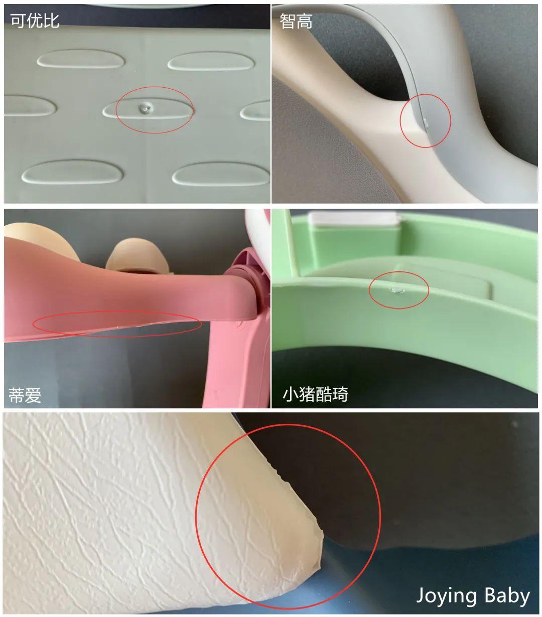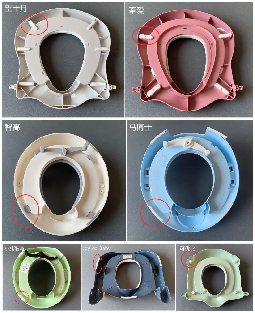 10款寶寶坐便圈中,可優(yōu)比踏板上、智高把手處發(fā)現(xiàn)了少許毛刺;蒂愛、小豬酷琦便圈搭腿處不夠光滑;Joying Baby的坐墊邊緣較尖銳。
