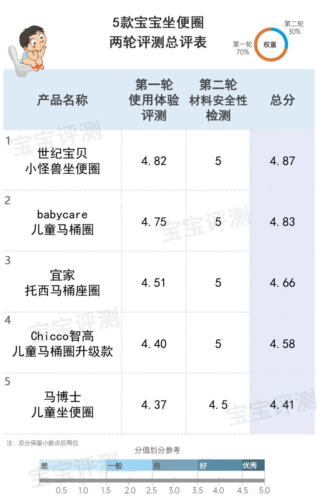 四、總評及綜合推薦綜合使用體驗評測和材料性檢測結果,5款寶寶坐便圈的終評分及排名情況如下: