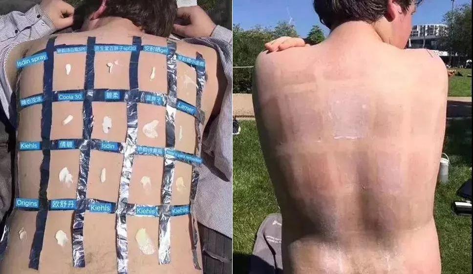 So,防曬工作還是要認(rèn)真做到位滴。說到防曬,外國小哥哥曾做了一組實驗:原本是為了測試15款防曬霜的防曬效果,結(jié)果皮膚完全沒有被曬紅的地方居然是貼了膠帶的部位!