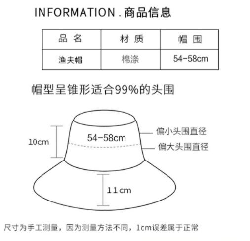 帽子的尺碼如下:立體的人性化設(shè)計,基本覆蓋了99%的人群。