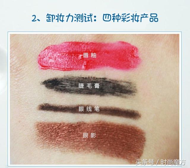 分別將唇釉、睫毛膏、眼線筆、眼影分別涂抹在手上,然后使用沾滿卸妝水的化妝棉輕輕擦拭,以測試卸妝水對不同彩妝產品的寫出強度。