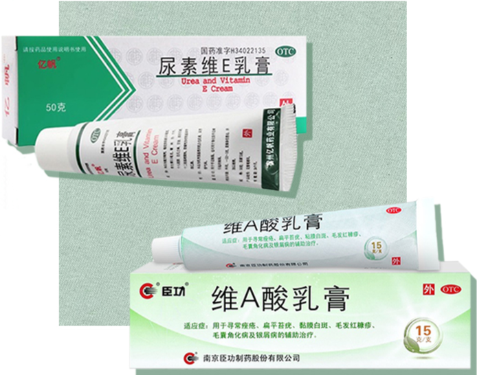 ①尿素軟膏+維A酸乳膏,一比一混合涂抹,每天兩次。