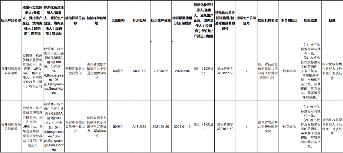 此次抽檢中,共有兩批次由URG Inc.生產(chǎn)、杭州優(yōu)姆品牌管理有限公司(在華責(zé)任單位:明可麗亞化妝品(廈門)有限公司)經(jīng)銷、規(guī)格為60毫升、標稱為香蒲麗保濕煥采防曬霜、批準文號/備案號國妝特進字J20191150的防曬霜被檢出標簽標識不合格。