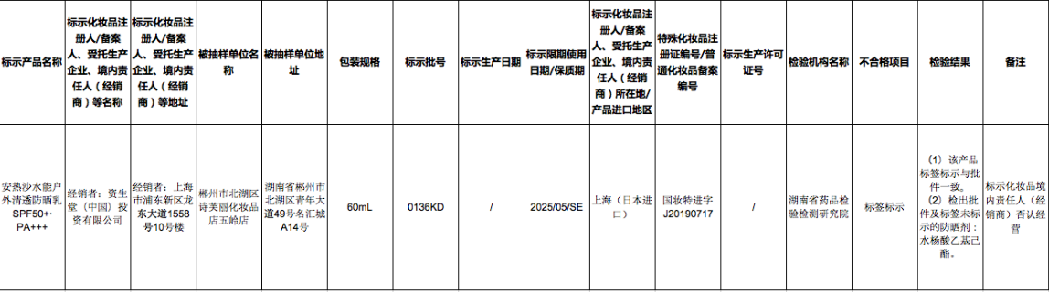此外,一批次標示經(jīng)銷者為資生堂(中國)投資有限公司、標稱為安熱沙水能戶外清透防曬乳SPF50+·PA+++、規(guī)格為60毫升、批準文號/備案號為國妝特進字J20190717的防曬乳,被檢出標簽標示不合格。檢驗結(jié)果顯示,該產(chǎn)品標簽標示與批件一致,檢出批件及標簽未標示的防曬劑:水楊酸乙基己酯。(標示化妝品境內(nèi)責(zé)任人(經(jīng)銷商)否認經(jīng)營)。