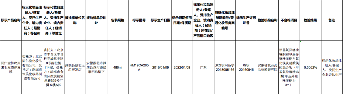 此次抽檢中,一批次委托方為北京同仁堂化妝品有限公司、被委托方為珠海市恒美化妝品制造有限公司、標稱為同仁堂植物原漿毛發(fā)修護發(fā)膜、規(guī)格為480毫升、批準文號/備案號為京G妝網(wǎng)備字2018005166、標示生產(chǎn)許可證號粵妝20160945的產(chǎn)品,被檢出甲基氯異噻唑啉酮和甲基異噻唑啉酮與氯化鎂及硝酸鎂的混合物(甲基氯異噻唑啉酮:甲基異噻唑啉酮為3:1)不合格,檢驗結(jié)果為0.0052%。(標示化妝品注冊人/備案人、受托生產(chǎn)企業(yè)否認生產(chǎn))。