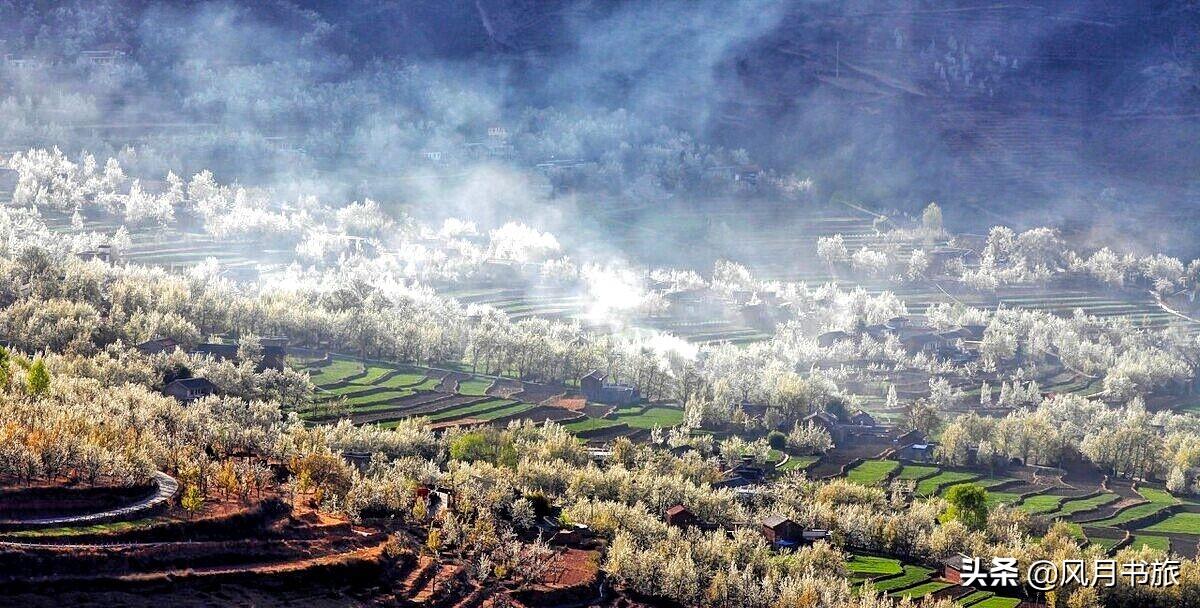傍晚日落前后,可以拍攝夕陽照耀下火紅的天空,炊煙裊裊的民居,以及萬畝潔白的梨花,形成冷暖色彩對比的光影照片。
