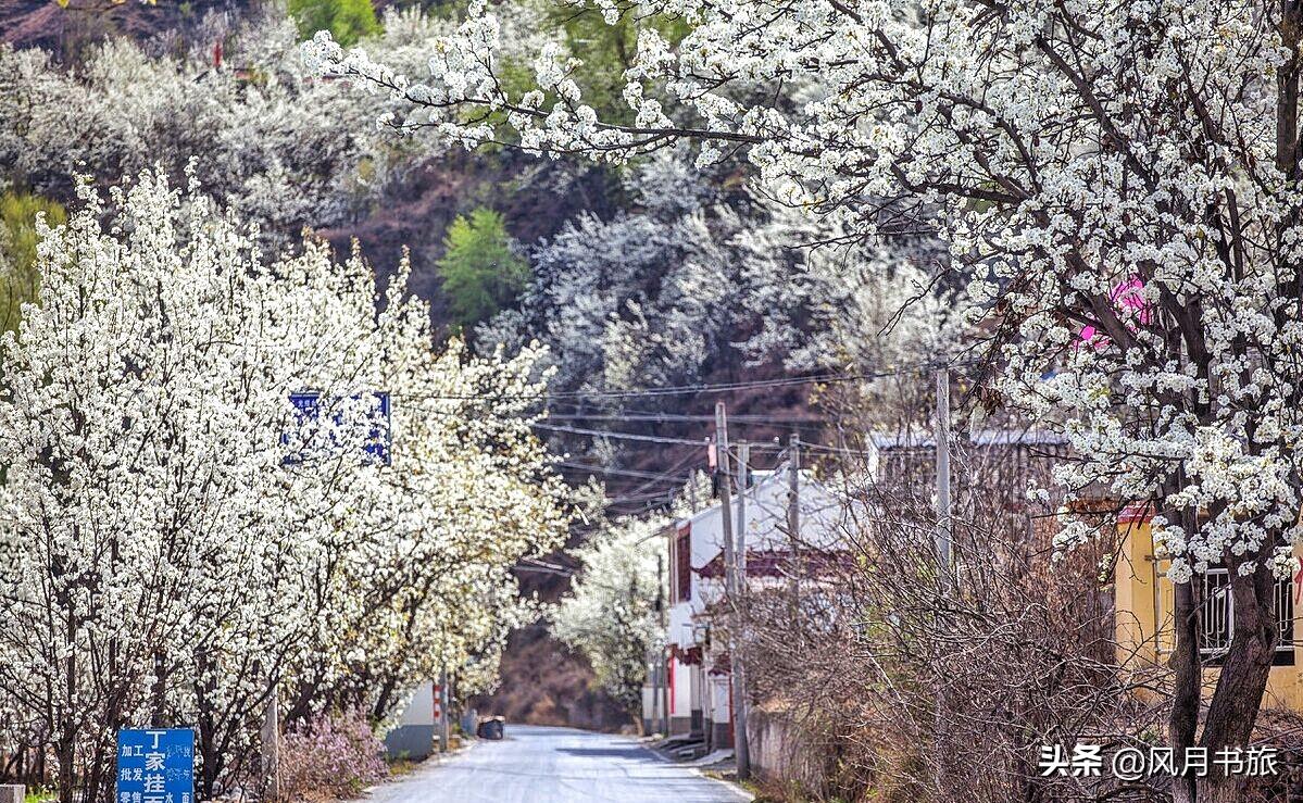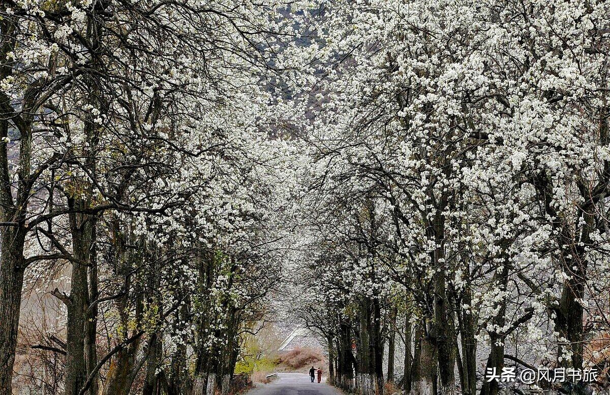 道路兩旁,樹身高大的梨樹,花朵開得茂盛,花瓣如絲絨般柔和,自然搭成一個天然屏障,過往的車輛和樹下的行人,穿行其間,粉妝玉砌,如入仙境!
