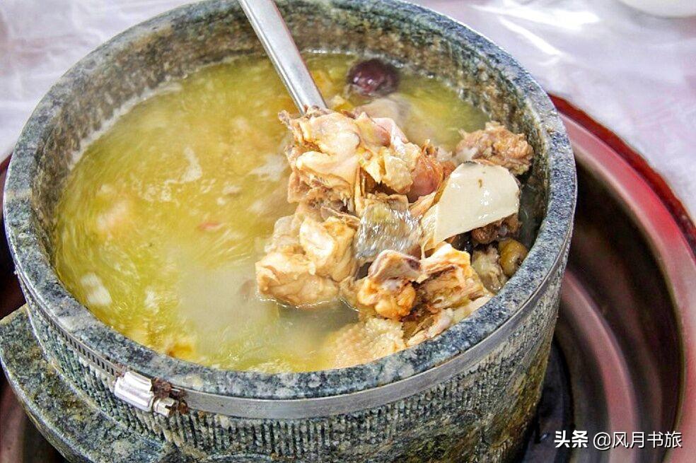 藏土雞,用雪山上流下的溪水,再配以人參、藏貝母、百合、枸杞等藥材慢燉兩個小時左右才上桌,是人間美味。