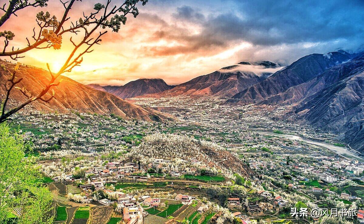 其一,山頂?shù)难┗ㄅc河谷的梨花競相爭艷。山頂是白雪的世界,落日將云彩燒得一片火紅。河谷,則是梨花的世界。白雪、梨花、晚霞,組成一幅天然圖畫!