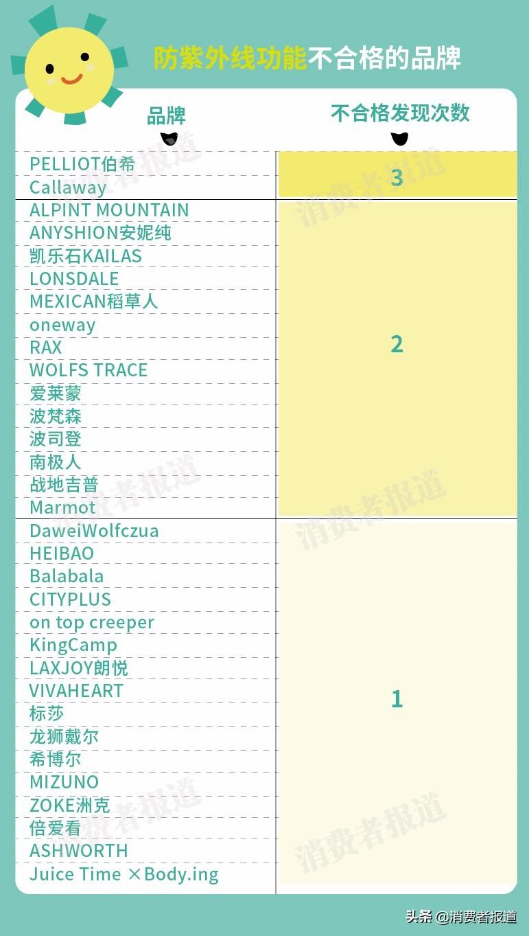 南極人、波司登、凱樂石等多次上“黑榜”檢測結(jié)果顯示,不合格的防曬服中不乏知名品牌和戶外品牌。其中,南極人、波司登、MEXICAN稻草人分別發(fā)現(xiàn)了2次不合格;戶外品牌凱樂石KAILAS、戰(zhàn)地吉普、波梵森也分別發(fā)現(xiàn)了2次不合格。
