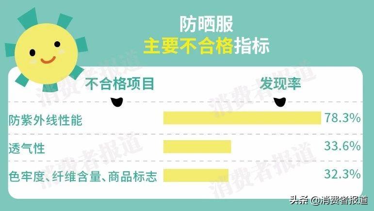 綜合數(shù)據(jù)顯示,抽檢的防曬服及標注具有防紫外線或防曬功能的服裝中,共有152批次不合格,不合格率達56.1%。
