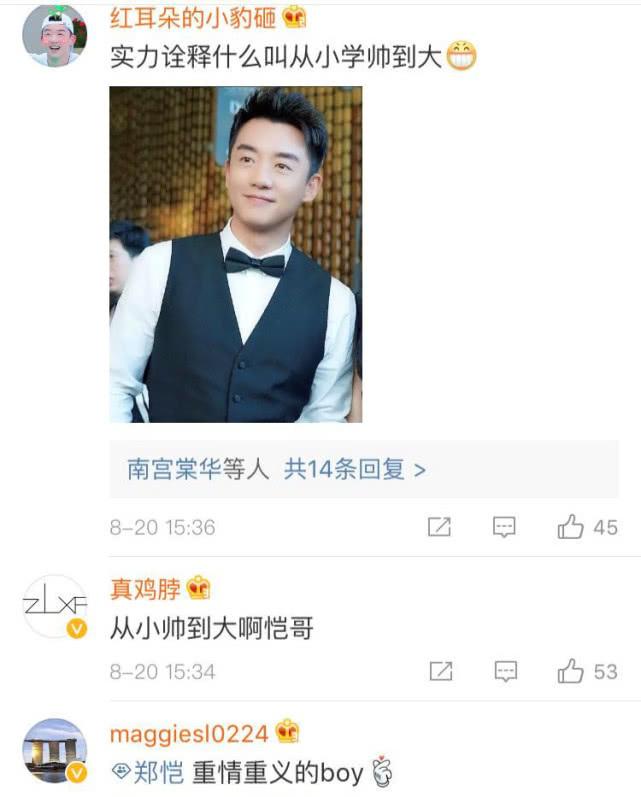 吃瓜群眾評(píng)論稱“鄭愷真是從小帥到大”,小時(shí)候的鄭愷眉清目秀四肢纖瘦,二十年后的他帥氣十足氣場(chǎng)全開風(fēng)度翩翩,曾經(jīng)高的鄭愷二十年后身高上卻沒了優(yōu)勢(shì)??催@張合影一眼就能認(rèn)出來(lái)哪個(gè)是鄭愷,歲月對(duì)他似乎特別的仁慈,網(wǎng)友表示“論保養(yǎng)的重要性”。照片中還有一位看上去也“似曾相識(shí)”,鄭愷曾經(jīng)出現(xiàn)在他的婚禮中并且微博曬照送新婚祝福。