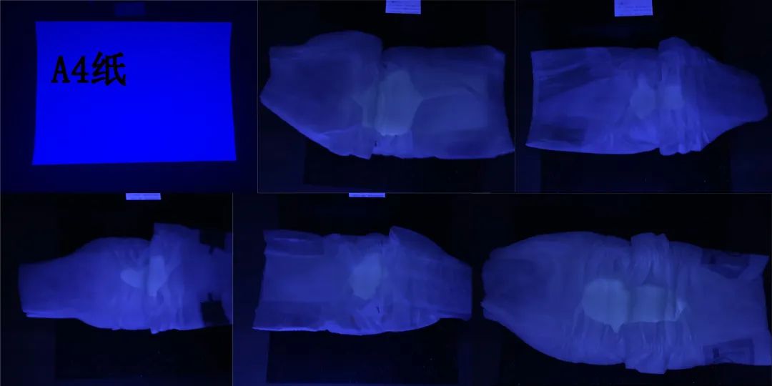 下圖是加了熒光增白劑的普通A4紙和5款紙尿褲的熒光反應(yīng)對比圖。5款紙尿褲均無熒光反應(yīng),可判斷均沒有熒光增白劑。