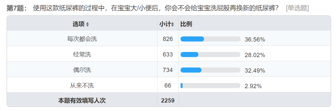 在回收的調(diào)查問卷中,有36.56%的寶媽表示每次大/小便后都會給寶寶清洗PP,32.49%的寶媽偶爾洗,有2.92%的寶媽表示從來沒有洗過。