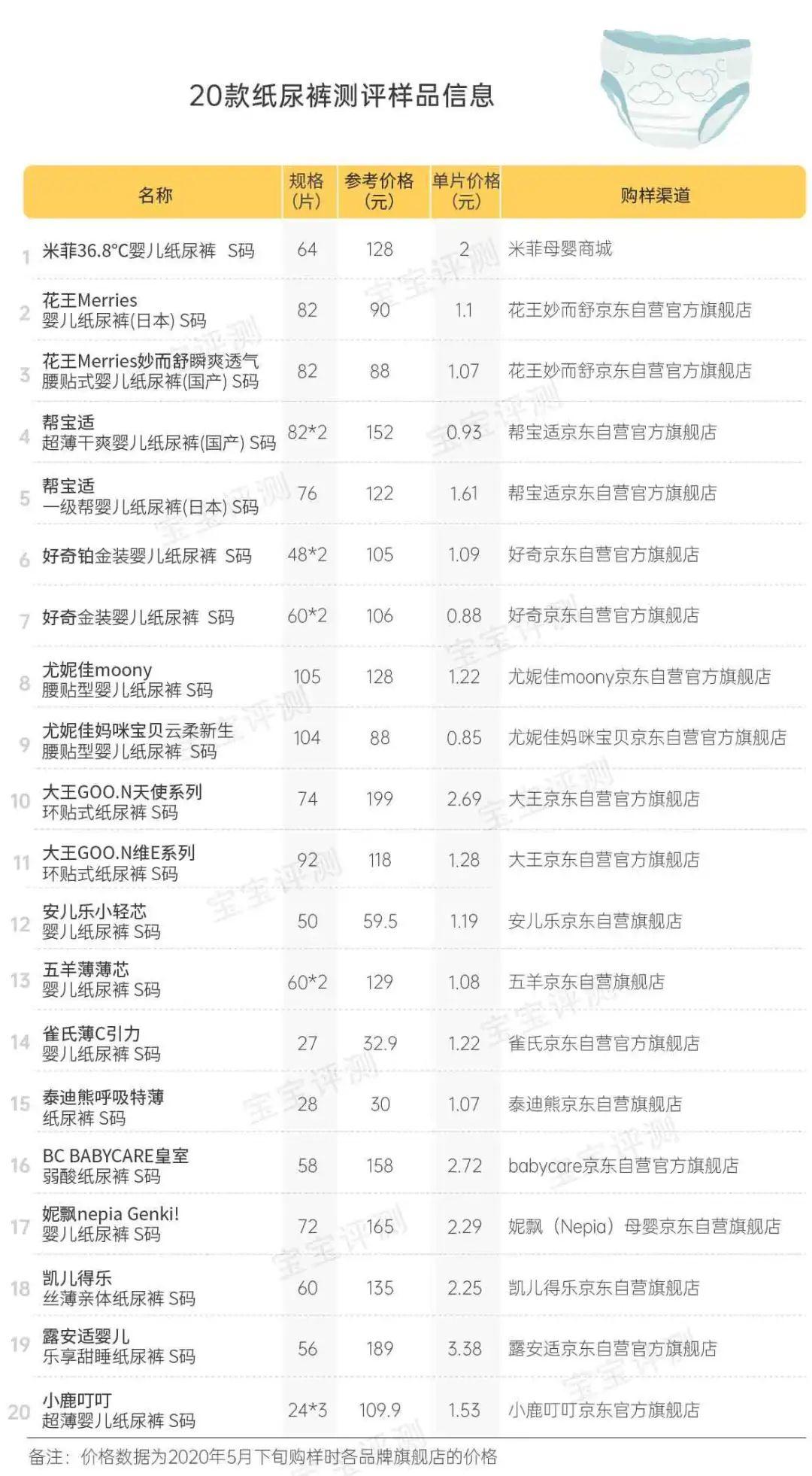 測評樣品市面上紙尿褲的品牌和系列多,笨爸爸綜合考慮了品牌知名度、銷量、渠道、價格,以及測評成本等因素,選擇了以下20款紙尿褲來進(jìn)行對比。
